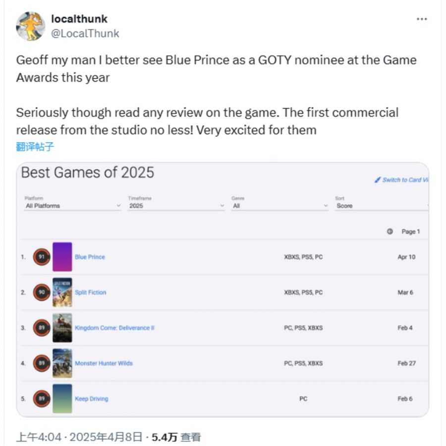 LocalThunk在推特上发文称,"Geoff(TGA创始人),今年的TGA颁奖礼上我要是看不到《蓝途王子》入围年度游戏提名,这事儿可没完!说真的,随便翻翻这游戏的评测就知道有多棒。这甚至还是他们工作室的首部作品!真为他们感到兴奋。"