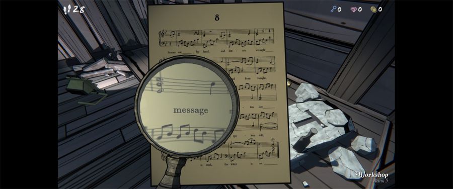 游戏的谜题和线索隐藏于所有文本和场景中,文本是故事,场景是美术,如果不解谜,它们可能看起来毫无值得关注的必要。