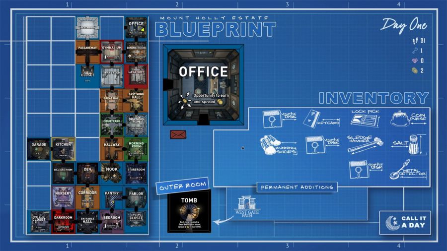 游戏的核心机制围绕着房间不断变换的 Mount Holly 庄园,从前厅开始进入一个9x5的迷宫,尝试找出第46个房间。你每天只有有限的步数在府邸中串行。每次开门,你都可以从三个不同类型的房间中选择一个“绘制”,决定下一个房间的类型和布局 。房间类型多样,奖励、惩罚、关键道具、门的数量和方向各不相同,玩家需要在这些特性中进行取舍 。例如,四通八达的走廊可能无法提供补给,储藏室能补充库存却会堵死路径,未升级的盥洗室则两者皆无,但跳过它又可能错过关键线索 。