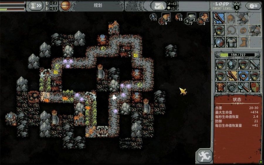 该作也有一定的肉鸽解谜要素,在游戏中,主角自动战斗,而玩家则扮演“策划者”。通过在地图循环路径上放置地形、建筑和敌人卡牌来解谜。目标是构建一个既能获取资源、又能击败BOSS,同时不让英雄暴毙的“完美循环”。策略规划如同解一个动态变化的谜题。